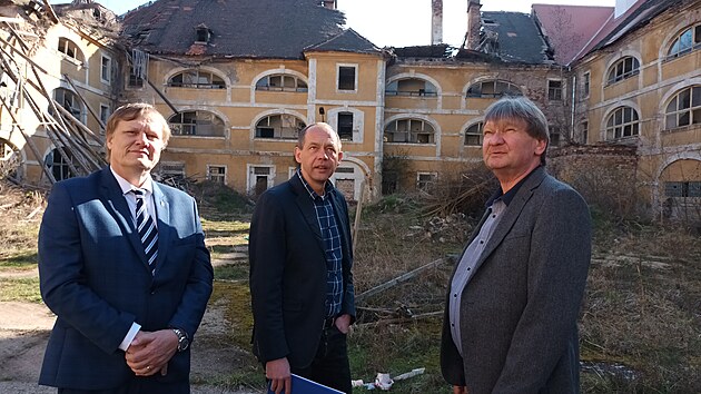 Ministr pro místní rozvoj Petr Kulhánek (za STAN) (na snímku uprostřed) navštívil Terezín, prohlédl si například Žižkovy kasárny. (4. dubna 2025)