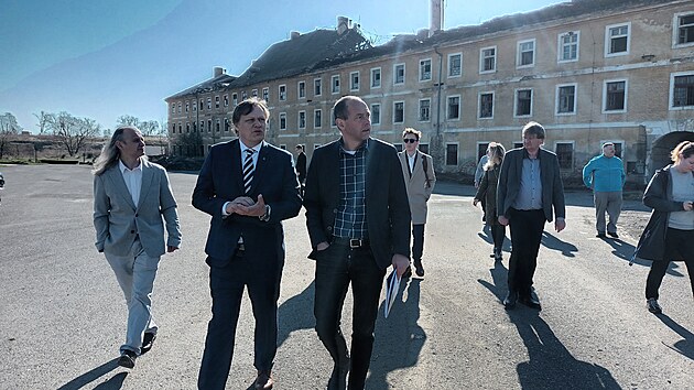 Ministr pro místní rozvoj Petr Kulhánek (za STAN) (na snímku v modré kostkované košili) navštívil Terezín, prohlédl si například Žižkovy kasárny. Doprovázel ho starosta města René Tomášek (po pravici ministra). (4. dubna 2025)