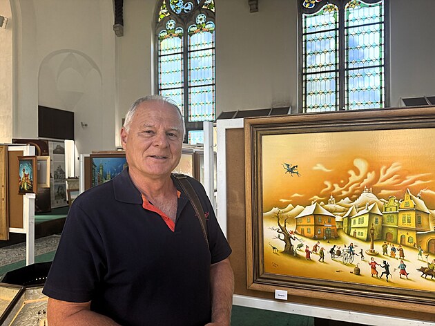 Mostecký malíř Eduard Bárta u jednoho ze svých obrazů na výstavě v Třebenicích.