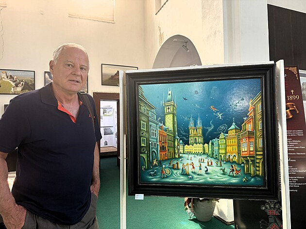 Mostecký malíř Eduard Bárta u jednoho ze svých obrazů na výstavě v Třebenicích.