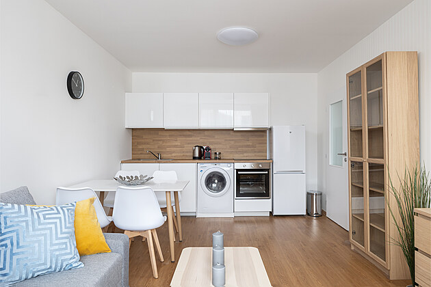 Kuchyně a obývací pokoj v bytě 2+kk