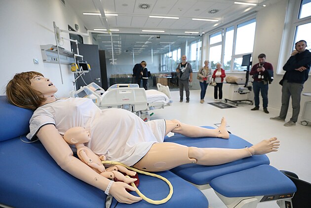 Simulační centrum a simulace porodu. Figurína například i sténá.