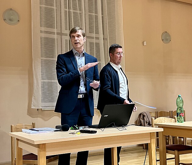 Zástupci společnosti meridian Nová Energie Pavel Mrva (vlevo) a Marek Vosyka na veřejném projednání v Cítolibech. (říjen 2025)