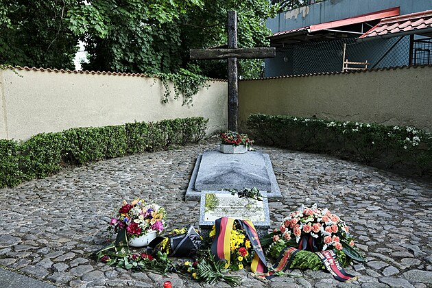 Na městském hřbitově v Žatci odhalili pamětní desku u příležitosti 80. výročí poválečného násilí vůči německy mluvícím obyvatelům města. (3. června 2025)