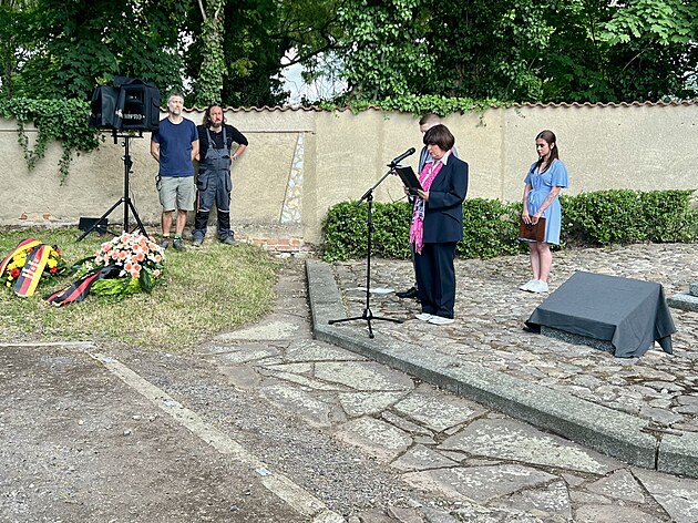 Na městském hřbitově v Žatci odhalili pamětní desku u příležitosti 80. výročí poválečného násilí vůči německy mluvícím obyvatelům města. (3. června 2025)