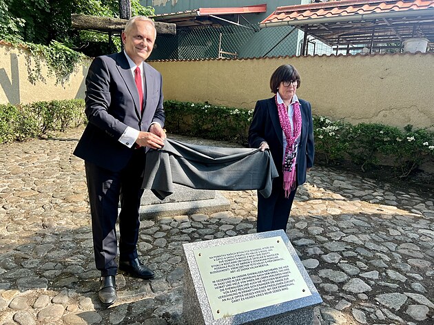 Na městském hřbitově v Žatci odhalili pamětní desku u příležitosti 80. výročí poválečného násilí vůči německy mluvícím obyvatelům města. (3. června 2025)