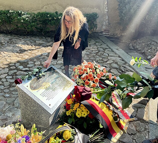 Na městském hřbitově v Žatci odhalili pamětní desku u příležitosti 80. výročí poválečného násilí vůči německy mluvícím obyvatelům města. (3. června 2025)