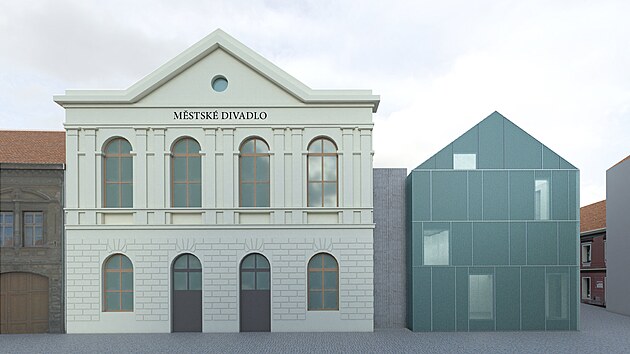 Takto by mělo divadlo v Žatci vypadat po rekonstrukci. Studie počítá se zbouráním nevhodné novodobé přístavby, která se stala součástí divadla v 60. letech minulého století, a vybudováním nové moderní budovy.