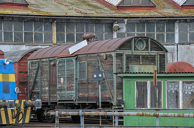 Areál železničního depozitáře NTM v bývalém lokomotivním depu Chomutov. Zaplněny jsou obě rotundy, řada strojů na střechu teprve čeká.