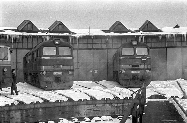 Sergeje T679.1441 a T679.1442 před rotundou depa Chomutov (5. března 1987)