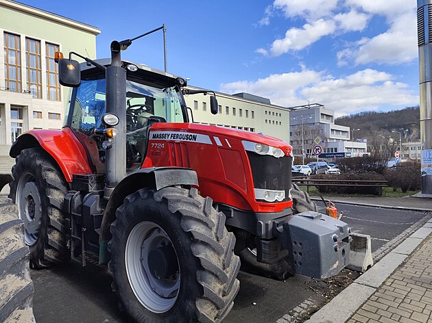 K budově Krajského úřadu v Ústí nad Labem dorazilo pět traktorů. Stalo se tak v rámci protestní jízdy zemědělců. (27. února 2025)