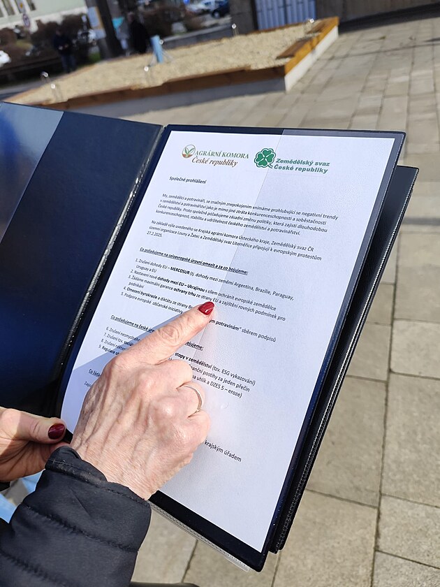 K budově Krajského úřadu v Ústí nad Labem dorazilo pět traktorů. Stalo se tak v rámci protestní jízdy zemědělců. Hejtmanovi předali prohlášení. (27. února 2025)