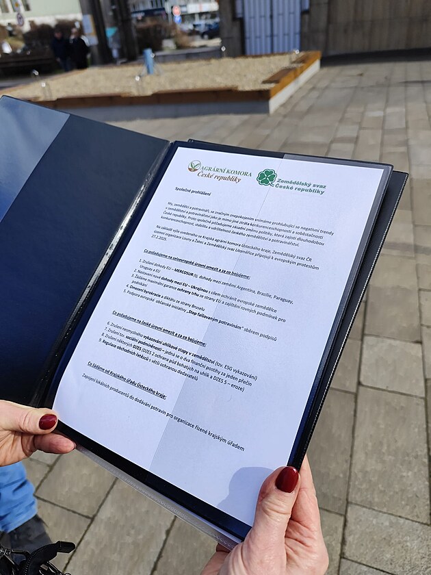 K budově Krajského úřadu v Ústí nad Labem dorazilo pět traktorů. Stalo se tak v rámci protestní jízdy zemědělců. Hejtmanovi předali prohlášení. (27. února 2025)