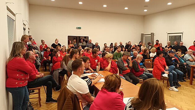 Zasedání zastupitelstva v Žitenicích na Litoměřicku. Sál kulturního domu byl úplně plný. Někteří podporovatelé odvolané starostky přišli v červeném oblečení. (30. září 2024)