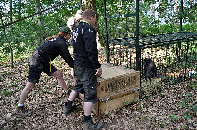 Makak uprchlý z děčínské zoo v odchytové kleci. (15. června 2023)