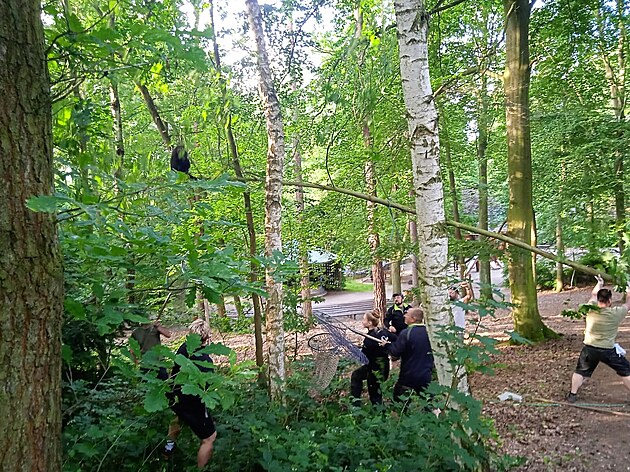 Snímek pořízený při odchytu dvou makaků, kteří utekli z výběhu v děčínské zoo. (13. června 2023)