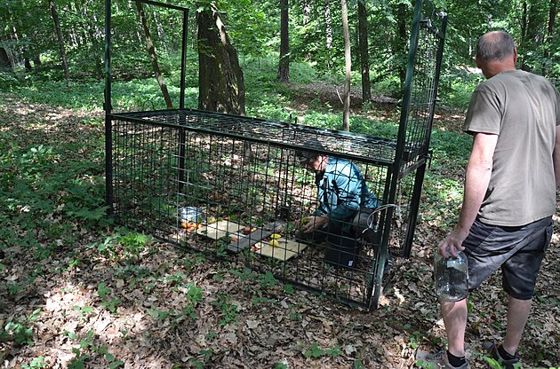 Příprava odchytové klece instalované ve snaze lapit makaky uprchlé z výběhu v děčínské zoo. (14. června 2023)