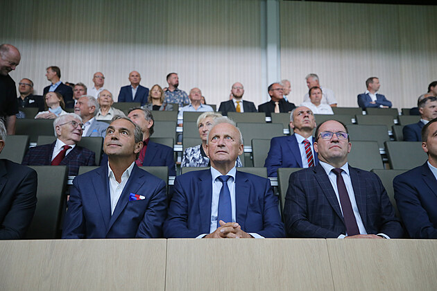 Školní budova stojí v pelhřimovském areálu společnosti Agrostroj. Její generální ředitel a majitel Lubomír Stoklásek (uprostřed) o zřízení školy usiloval kvůli zvýšení kvalifikace technických pracovníků.