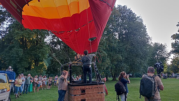 Hromadný start horkovzdušných balónů na 29. ročníku akce Balóny nad Telčí. (15. srpna 2025)