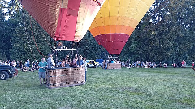Hromadný start horkovzdušných balónů na 29. ročníku akce Balóny nad Telčí. (15. srpna 2025)