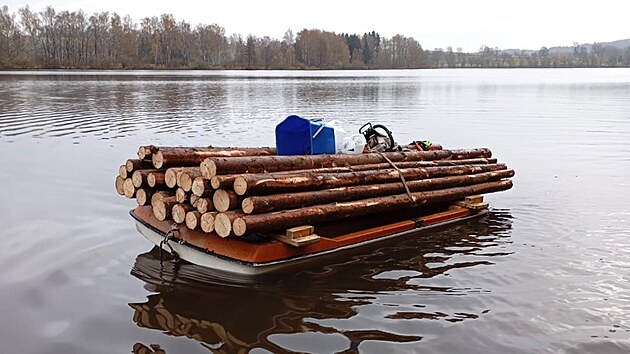 Když se budoucí mostek pro běžkaře nachází v bažině, musí jeho stavitel improvizovat. Josef Holemář přepravil těžký materiál na místo lodí.