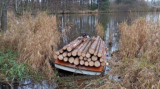 Když se budoucí mostek pro běžkaře nachází v bažině, musí jeho stavitel improvizovat. Josef Holemář přepravil těžký materiál na místo lodí.