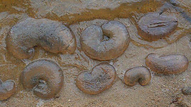 Břeh je tam pokryt stovkami vyplavených rosolovitých exemplářů různých velikostí.