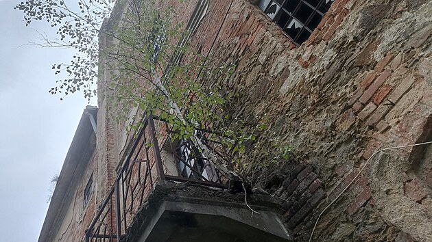 O zanedbanosti většiny areálu svědčí i tato bříza, která už desítky let vyrůstá z jednoho z balkonů.