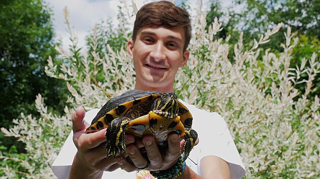 Zhruba desetiletá želva obývá oplocené jezírko na zahradě. Jednou se jí povedlo utéct a udělala si tříměsíční prázdniny v blízké řece.