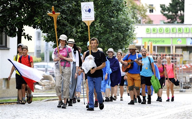 Zhruba třicítku poutníků z Prahy zachytil fotograf při cestě Havlíčkových Brodem. To už měli v nohách 127 kilometrů. Celkem museli urazit z české metropole až do Slavkovic 170 kilometrů. Všichni odstartovali minulou sobotu.