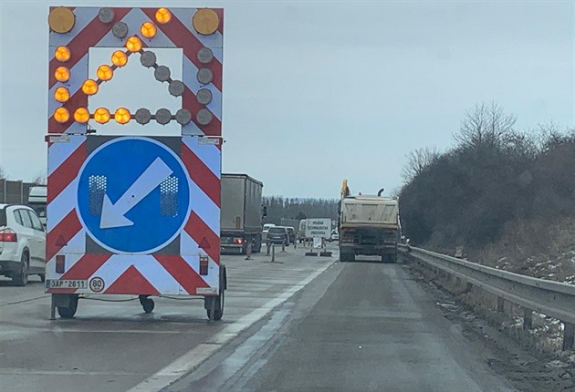 Obě poškozená místa jsou označena. Pravý pruh je v délce zhruba 200 metrů v místech havárie uzavřen, jezdí se pouze pruhem levým.