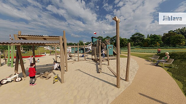 Vodní plochu na připravovaném dětském hřišti v areálu Český mlýn v Jihlavě má návštěvníkům znázorňovat rozsáhlý prostor s pískem a kameny.