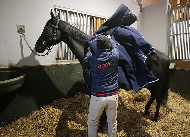Vítěz Velké pardubické Godfrey s trenérem Daliborem Törökem ve zhořské stáji DS Pegas. (2024)