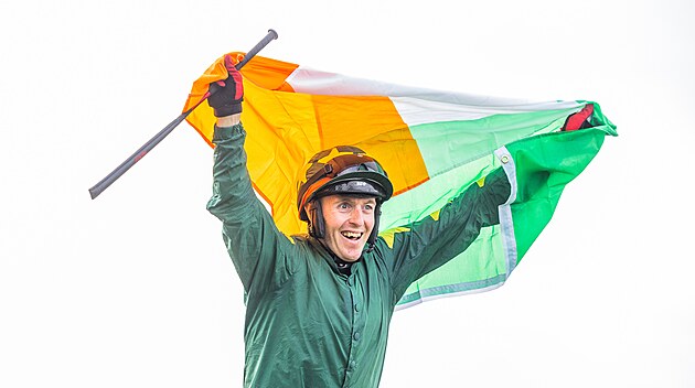 Irský žokej Keith Donoghue s vlajkou slaví vítězství se Stumptownem na Velké pardubické.