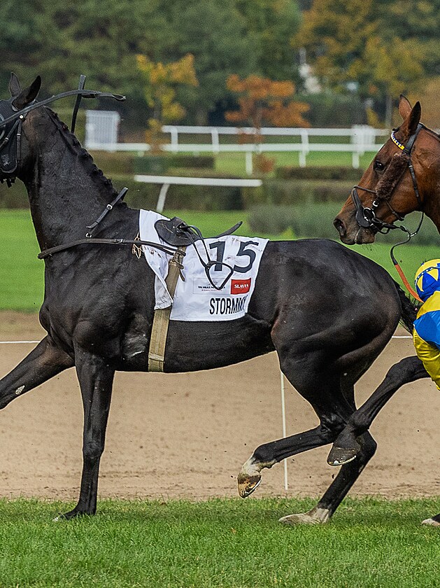 Žokej Ondřej Velek padá z Klarka Kenta po Taxisově příkopu.