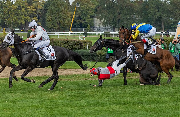 Drama na Taxisu: nejtěžší překážku nezvládli Klarc Kent s žokejem Ondřejem Velekem (vpravo) a Stormmy s Martinem Liškou.