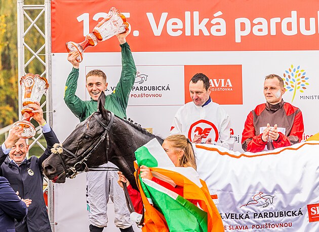 Keith Donoghue (vlevo) slaví s pohárem vítězství ve Velké pardubické, druhý skončil Jan Faltejsek, třetí Adam Čmiel.