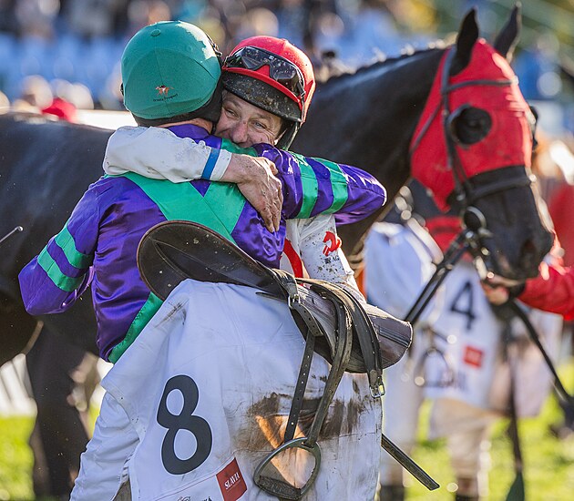 Žokejové Jan Faltejsek (čelem) a Jaroslav Myška se objímají v cíli Velké pardubické 2024. V tu chvíli ještě nevěděli, že jsou oba vítězi.