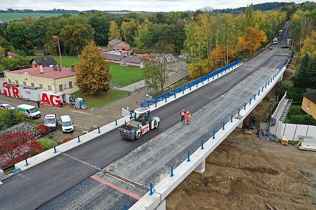 Nový silniční most v Habrech na fotografii těsně před dokončením. Hlavní tah mezi Havlíčkovým Brodem a Kolínem se po čtyřech měsících otevře v sobotu ráno. Uzavírka působila spoustu komplikací.