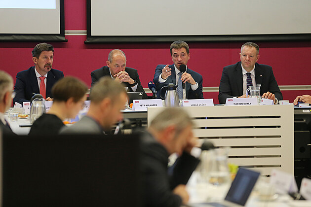 Na třebíčském představení studie o dopadech dostavby diskutuje ministr průmyslu a obchodu Lukáš Vlček, naslouchá třebíčský starosta Pavel Pacal, hejtman Vysočiny Martin Kukla a ministr pro místní rozvoj Petr Kulhánek.
