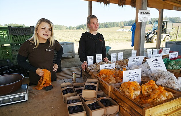 Mladí farmáři v Útěchovičkách prodávají své produkty přímo na poli hned u silnice. Pomáhají jim brigádníci.
