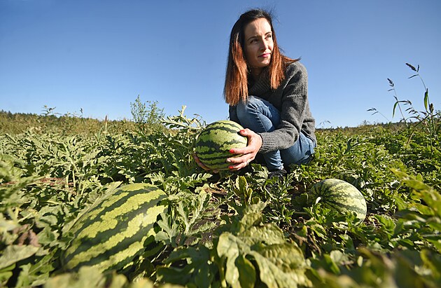 Dozrává druhá várka vodních melounů farmářů z Útěchoviček. Na snímku jednatelka farmy Gabriela Pechová.