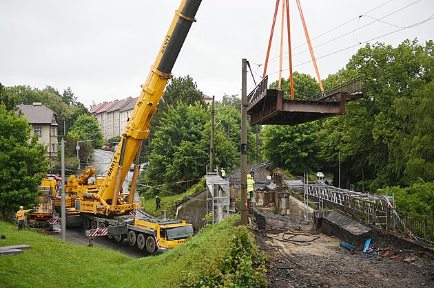 V Havlíčkově ulici v Jihlavě snášeli specialisté pomocí jeřábu železniční most. (8. června 2025)