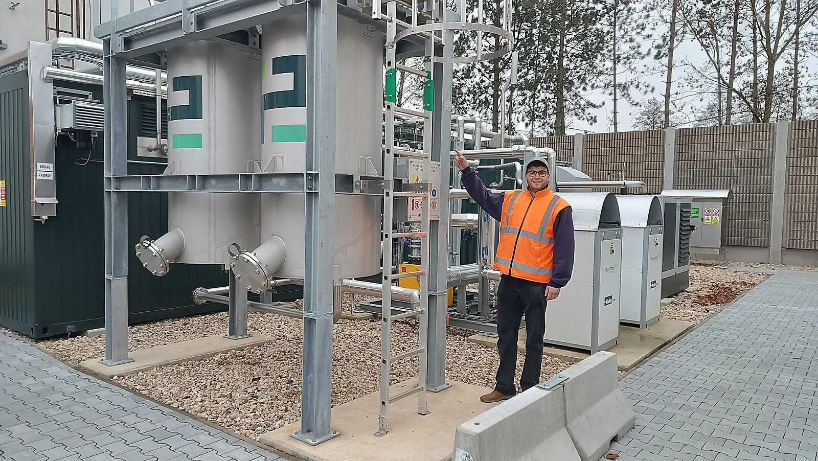 Díky nové technologii brodská čistírna dokáže za rok dodat množství plynu, které odpovídá spotřebě 200 rodinných domů či 400 bytů. Na snímku Zdeněk Zelený, vedoucí provozu čistíren odpadních vod ve společnosti Vodovody a kanalizace Havlíčkův Brod (v oranžovém), a ředitel VaK HB Jan Kadlec.