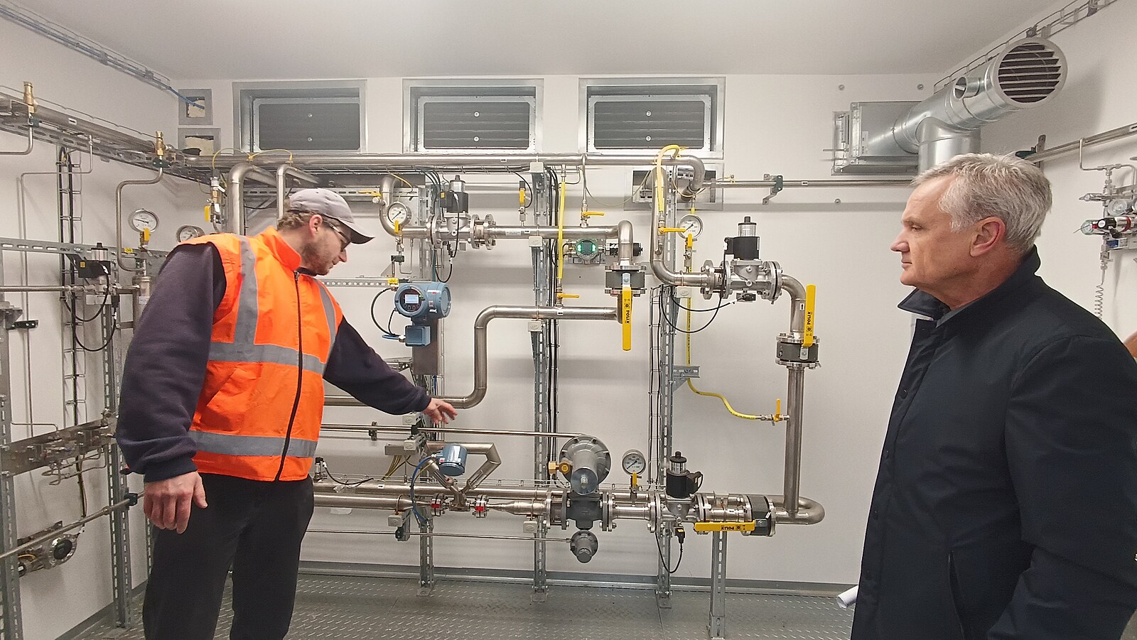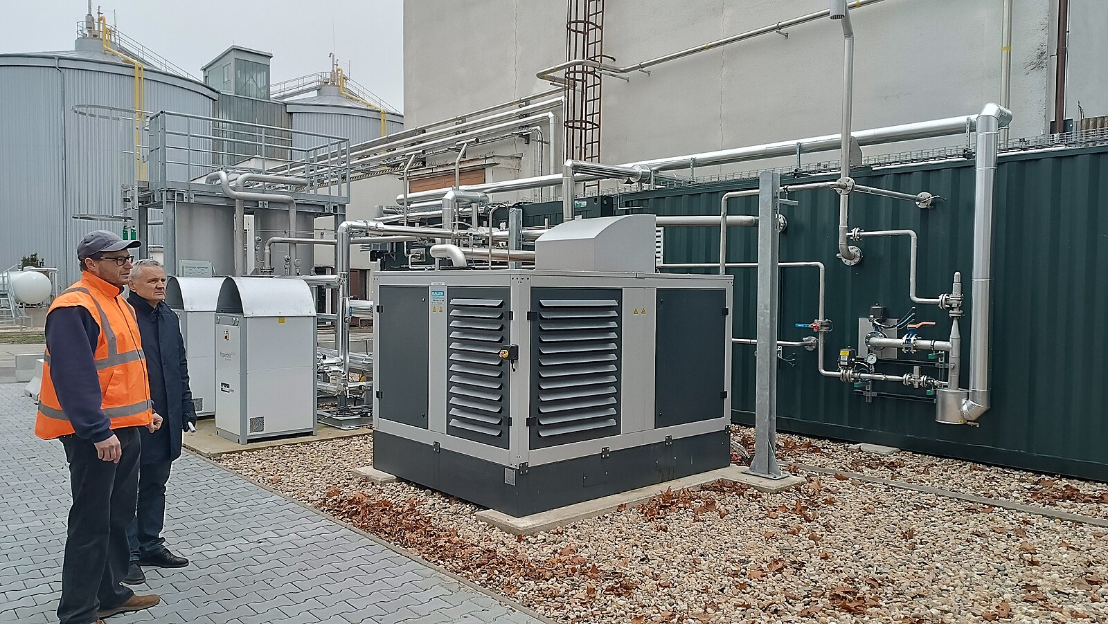 Díky nové technologii brodská čistírna dokáže za rok dodat množství plynu, které odpovídá spotřebě 200 rodinných domů či 400 bytů. Na snímku Zdeněk Zelený, vedoucí provozu čistíren odpadních vod ve společnosti Vodovody a kanalizace Havlíčkův Brod (vlevo v oranžovém) a ředitel VaK HB Jan Kadlec.