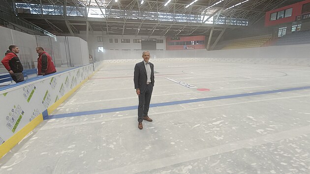 Ledová plocha v Kotlině byla při rekonstrukci podstatně zúžena, na každé dlouhé straně o dva metry. Nové jsou střídačky či trestné lavice. Ve středu postup prací zkontroloval starosta Zbyněk Stejskal.