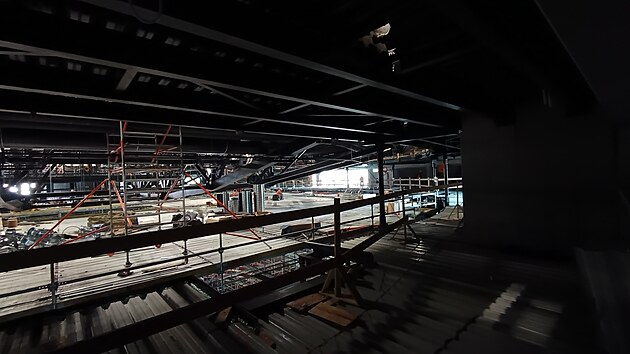Uvnitř haly to v těchto dnech vypadá jako v dokonalém bludišti. Kvůli instalaci technologií pod střechu je celý interiér zastavěný lešením.