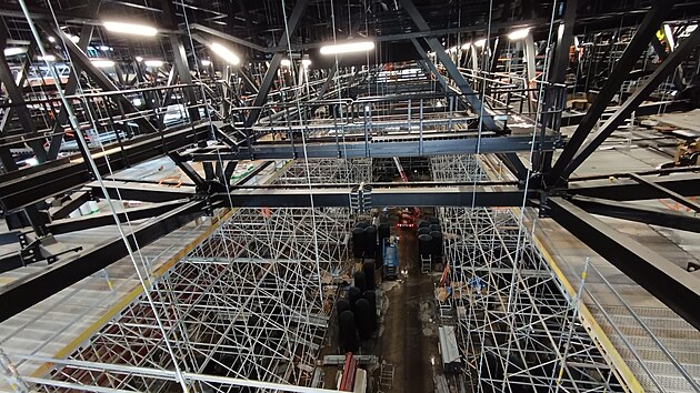Uvnitř haly to v těchto dnech vypadá jako v dokonalém bludišti. Kvůli instalaci technologií pod střechu je celý interiér zastavěný lešením.