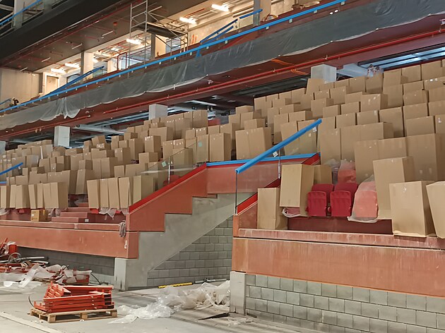 V rozestavěné aréně jsou už rozmístěny sedačky, které jsou zatím z bezpečnostních důvodů zakryty.