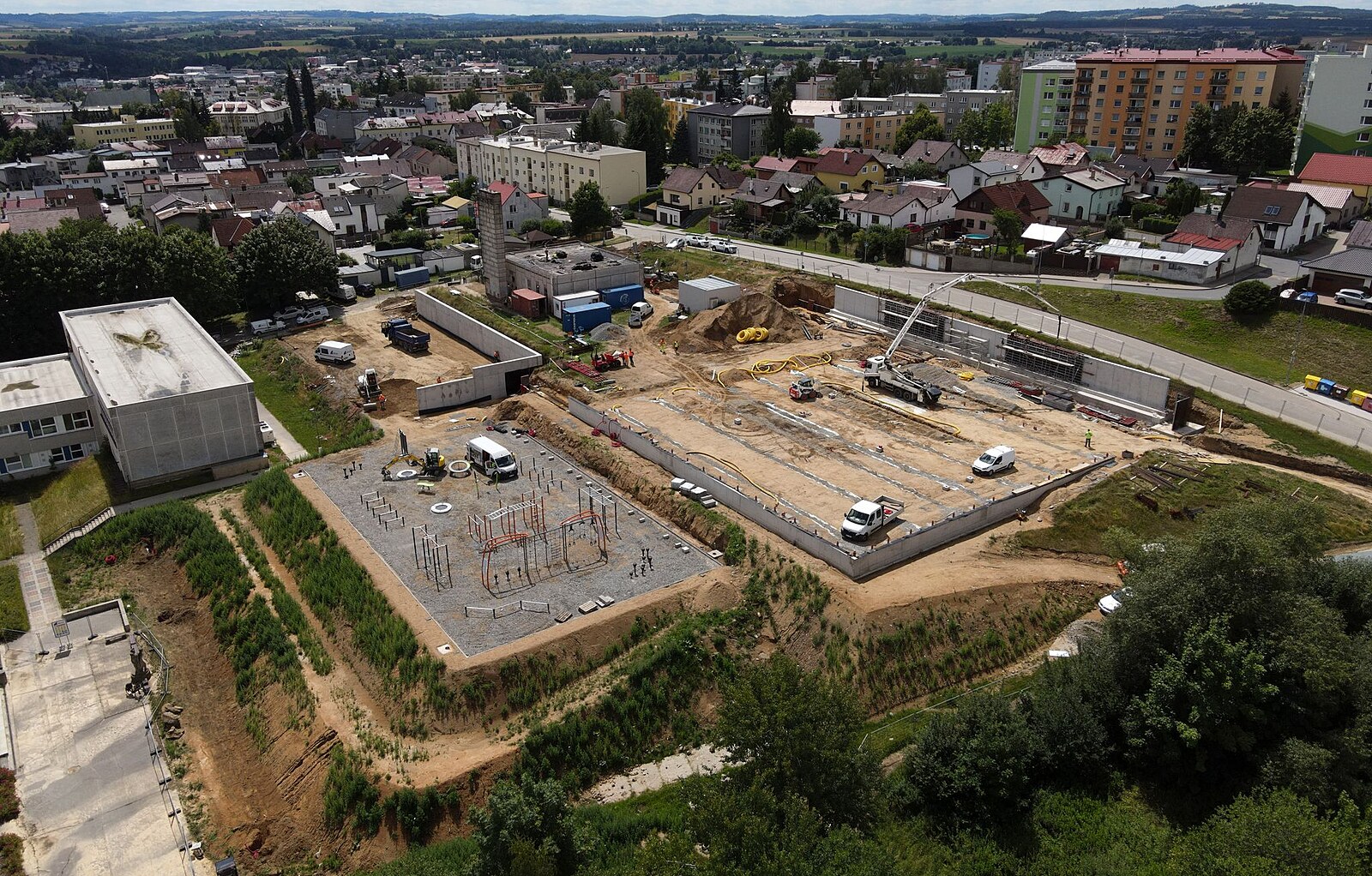 V současné době jsou v plném běhu práce na finálním dorovnání štěrkové vrstvy multifunkčního hřiště i tenisového hřiště, budují se opěrné konstrukce pod plošinou pro imobilní občany a pokračuje výstavba zázemí pro veřejnost.